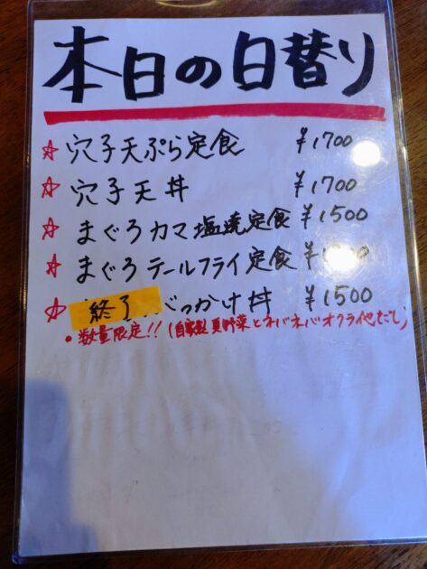 「日替わり定食」は、その日の仕入れによって変わる旬の味が楽しめるメニューです。この日のおすすめは、マグロカマ塩焼き定食でした!